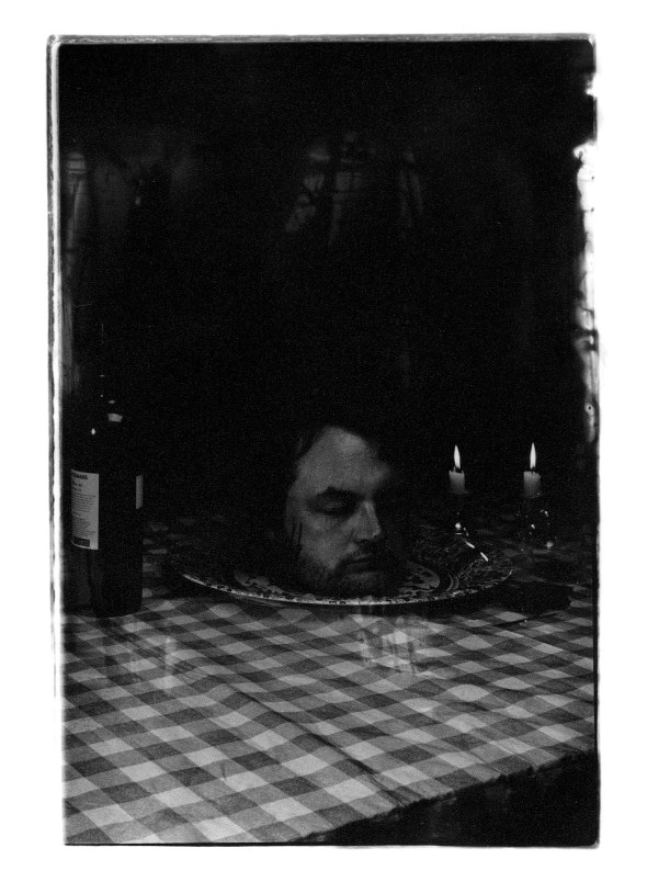 This is a scan of a black and white print. No Photoshop involved. I cut a hole in a piece of wood and then placed a tablecloth over it, also with a hole cut in it, then a plastic plate had a chunk cut out and the model was kneeling on the floor. Developer was painted on with a brush to get that uneven effect.