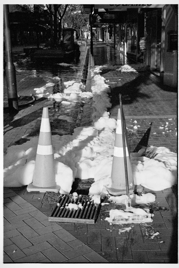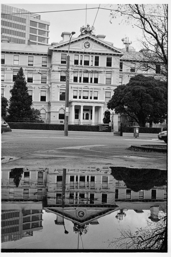 Seen opposite The Beehive in Wellington after a heavy rain and a blocked drain.