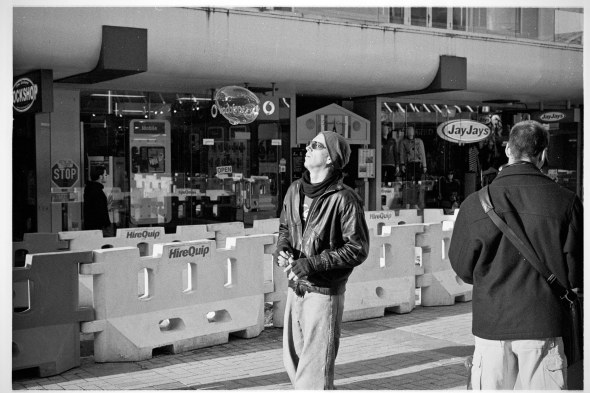 Man blowing bubbles in Manners Mall, Wellington.