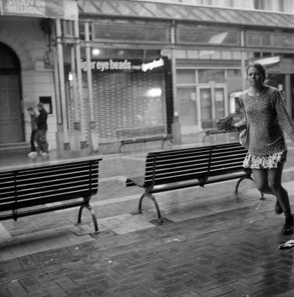 I saw her running across the mall from the money machine and totally thought I had fired the shot too early (possibly a little bit early) and missed her altogether. Film is great for surprises.