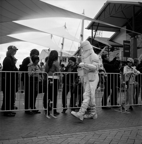 The Armageddon/Comicon event was on in the weekend, I spotted this at the queue to get in. Is it ethical for collectors for (I am assuming) the Christchurch earthquake to have guns? Kinda takes it to the next level really. I did also miss a shot of Darth Vader also collecting…