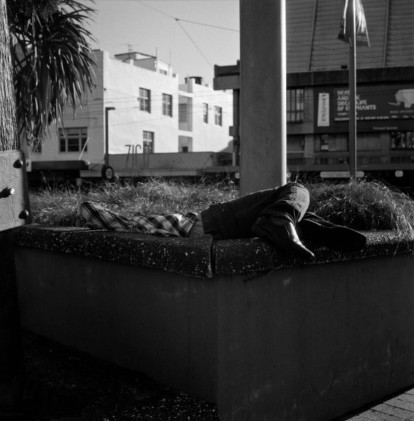 Couple of views of the same sleeper on Cuba Street last Saturday morning… I like the hat under the seat… I wonder if he found it when he woke up?
