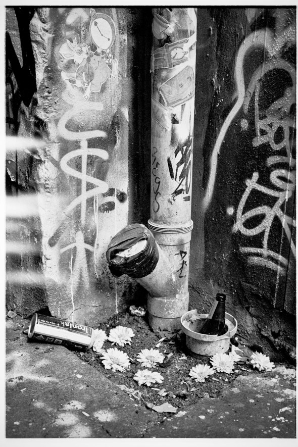 Random flowers mixed in with empty spray can, beer bottle and downpipe.