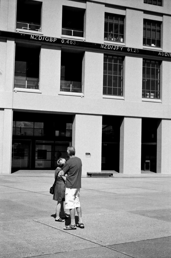 Spotted these two people watching the stock exchange/exchange rate board on the Wellington waterfront… I wondered if they were waiting for the financial after effects of the Christchurch earthquake to hit…