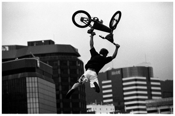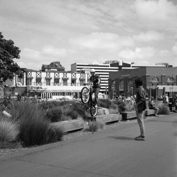 Yesterday I went to the Bowlarama skate competition (big post coming tomorrow if I get all the images processed) and about half way through I remembered that I had parked my car on a 2 hour park and that was something like 3 hours ago. Luckily no ticket when I got back to it and snapped this guy doing trials stuff on his bike on the way back…