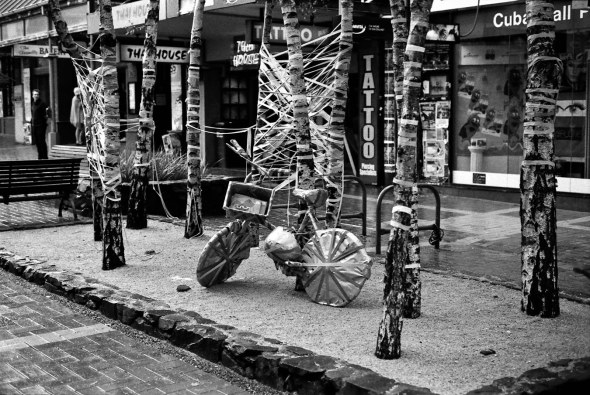 Bike and trees all wrapped up with fliers for the Fringe Festival I think…