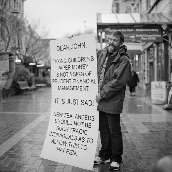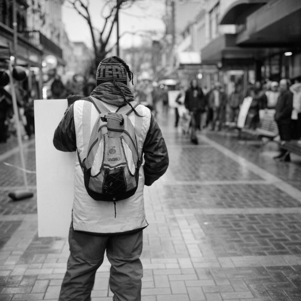 I went to the GCSB Protest in Wellington last Saturday along with my trusty Rolleiflex 🙂 Only just started scanning the shots today and so far this one stands out…