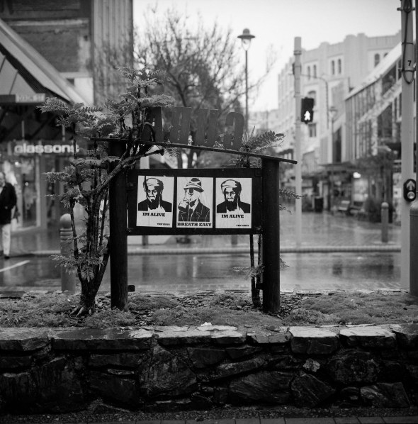 The first shot is sitting outside the St James Theater on Courtenay Place drinking coffee with Rollei on the table pre-focused and the second is on Cuba Street outside J J Murphy’s drinking beer with the same setup although I did have to get Fergus to lean out of the shot while I took it and it was a bit under exposed…