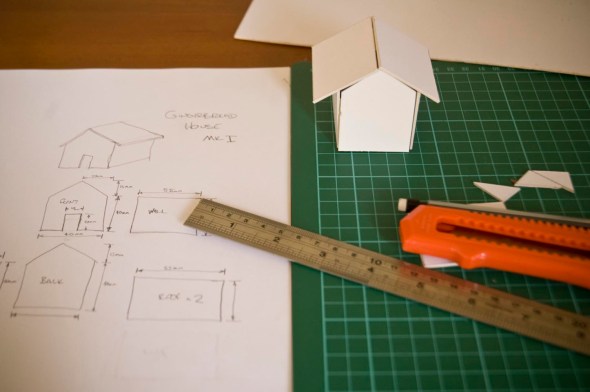 I drew out a quick sketch (thank you 5th form technical drawing) to make sure it was kind of what Em was thinking and then made up a small model to check it would work and also to be used as a cutting template.