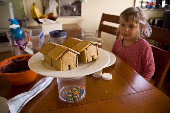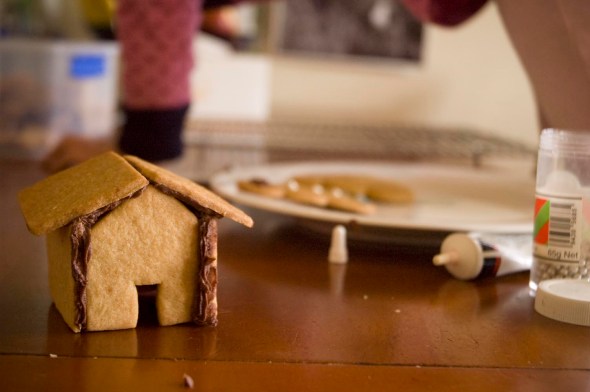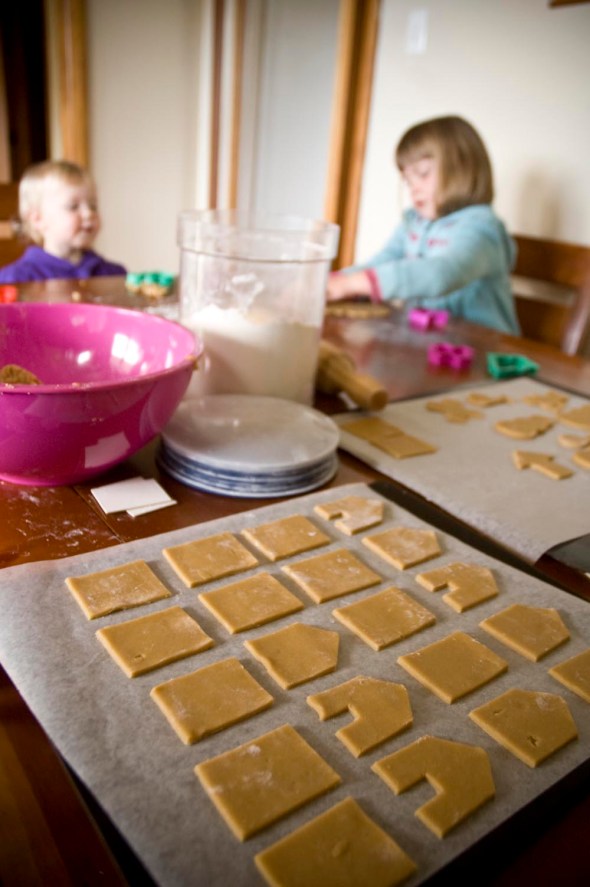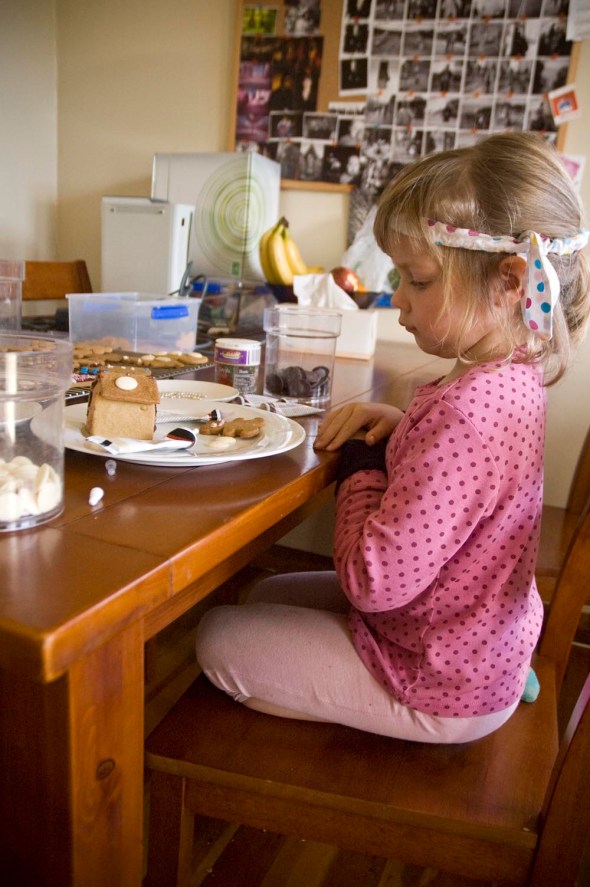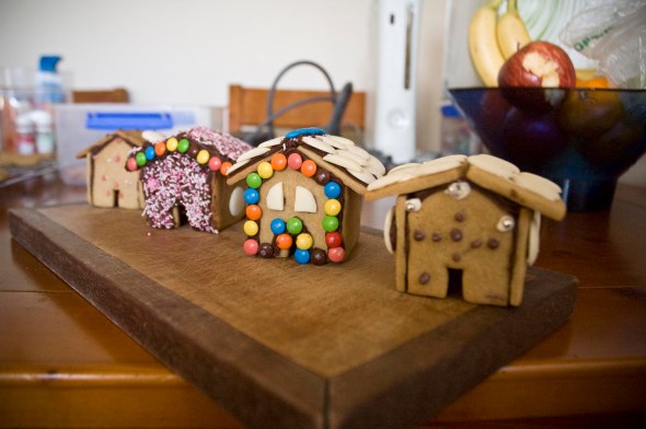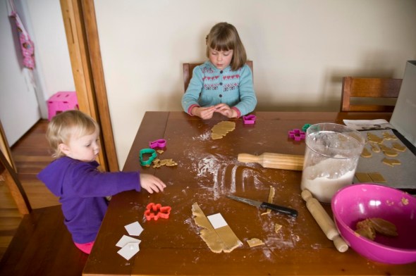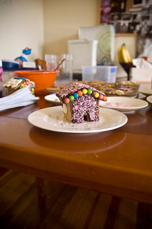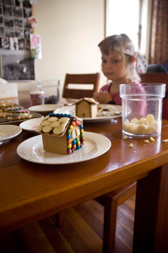 About a week ago Emily suggested that we make gingerbread houses (I’m pretty sure she meant real life sized ones, or at least dolls house sized ones) since every couple of weeks we make gingerbread men while Samantha has a lunch time sleep and then decorate them the next day at the same time. Sam usually wakes up once we have done most of it but there are always things left for her to do as well (usually eating the decorating things and left over dough as well as cutting the last few shapes out).