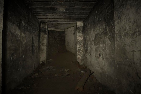 The entrance (not the best photo but have still got to develop the other films) is a small hole just behind the pit where the disappearing gun sat is the only entrance but after you have slid down it opens out to full height tunnels and rooms.