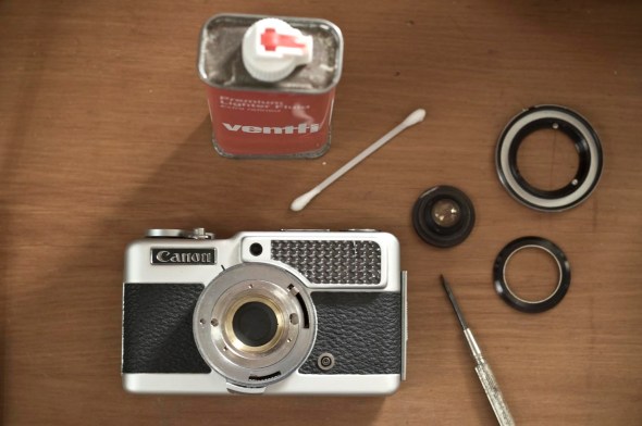 After removing the front lens cover and lens as well as the shutter speed ring I was at the shutter. Some lighter fluid on the end of a cottonbud and Viola! I now had a working Demi.