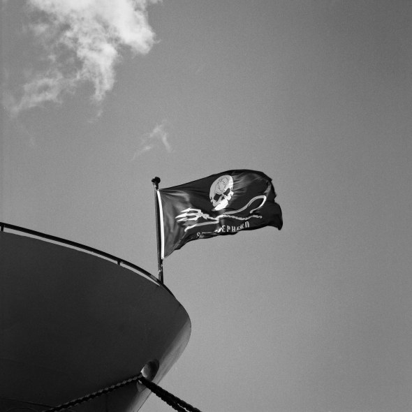 The Sea Shepherd flag on the back of the Bob Barker vessel as it resupplies in Wellington before heading south to link up with the Steve Irwin to protest against whaling in the southern ocean.